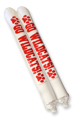 The first option is the original inflatable thunder sticks. Much like a balloon but much more durable, these tubes of air come in pairs and are hit together to create noise. They can be customized according to what you're in need of, including text and logos, which can be included either on one side or both sides of the stick. With 12 colors of tubes and 17 colors for the text and/or logos, you're sure to find something that matches the home team colors.
